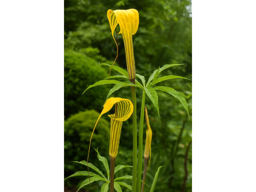 Arizéma 'Arisaema flavum' (Arisaema flavum) je exotická trvalka původem z horských oblastí Asie, která vyniká drobnými žlutými květy připomínajícími tvar kalichu. Tyto květy jsou doplněny elegantními zelenými listy a vytvářejí okouzlující prvek stinných zahrad. Kvete od června do července a je ideální pro přírodní kompozice, záhony nebo jako solitér.