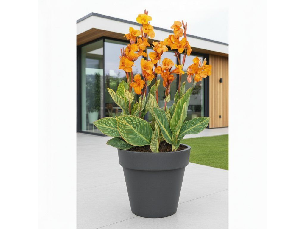 Dosna 'Pretoria' (Canna) je okouzlující odrůda, která vyniká svými sytě oranžovými květy a nápadným pruhovaným olistěním. Listy jsou tmavě zelené s jasně žlutými pruhy, které dodávají rostlině exotický vzhled. Tato kombinace květů a listů činí z dosny 'Pretoria' nepřehlédnutelný prvek v každé zahradě nebo na terase.