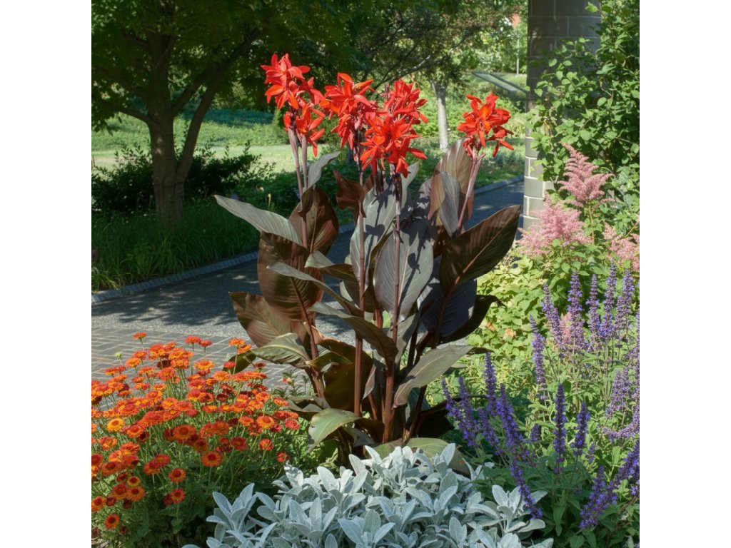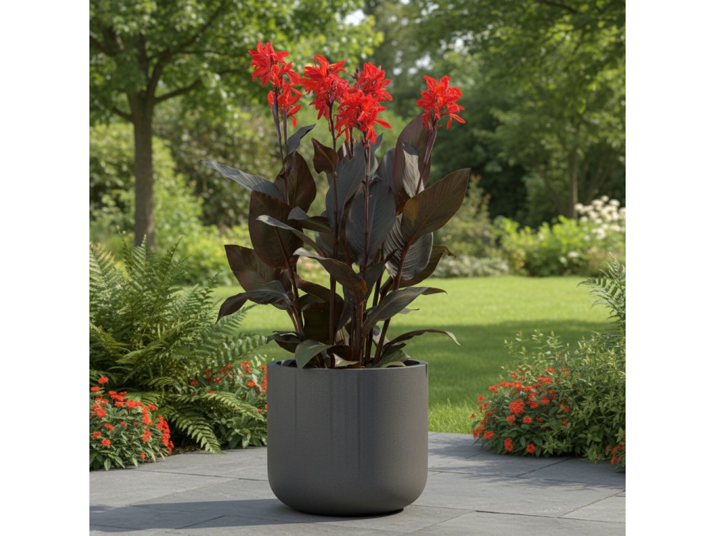 Dosna 'Red Futurity' (Canna indica) je exotická rostlina s velkými, sytě červenými květy a tmavě zelenými až bronzovými listy. Tato odrůda přináší do zahrady či na terasu tropický nádech a stává se výrazným prvkem v letních záhonech nebo velkých nádobách. Kvete od července do září a díky dlouhé době kvetení přináší radost celé léto.