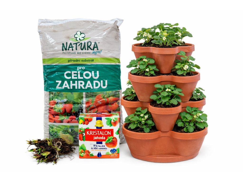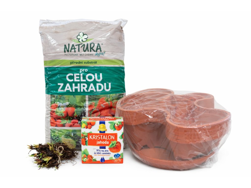 Sada obsahuje vše, co potřebujete k úspěšnému pěstování: frigo sazenice převislé odrůdy 'Mara des Bois', která chutí připomíná lesní jahody, speciální substrát pro optimální růst a hnojivo Kristalon Jahoda, které zajistí bohatou úrodu.