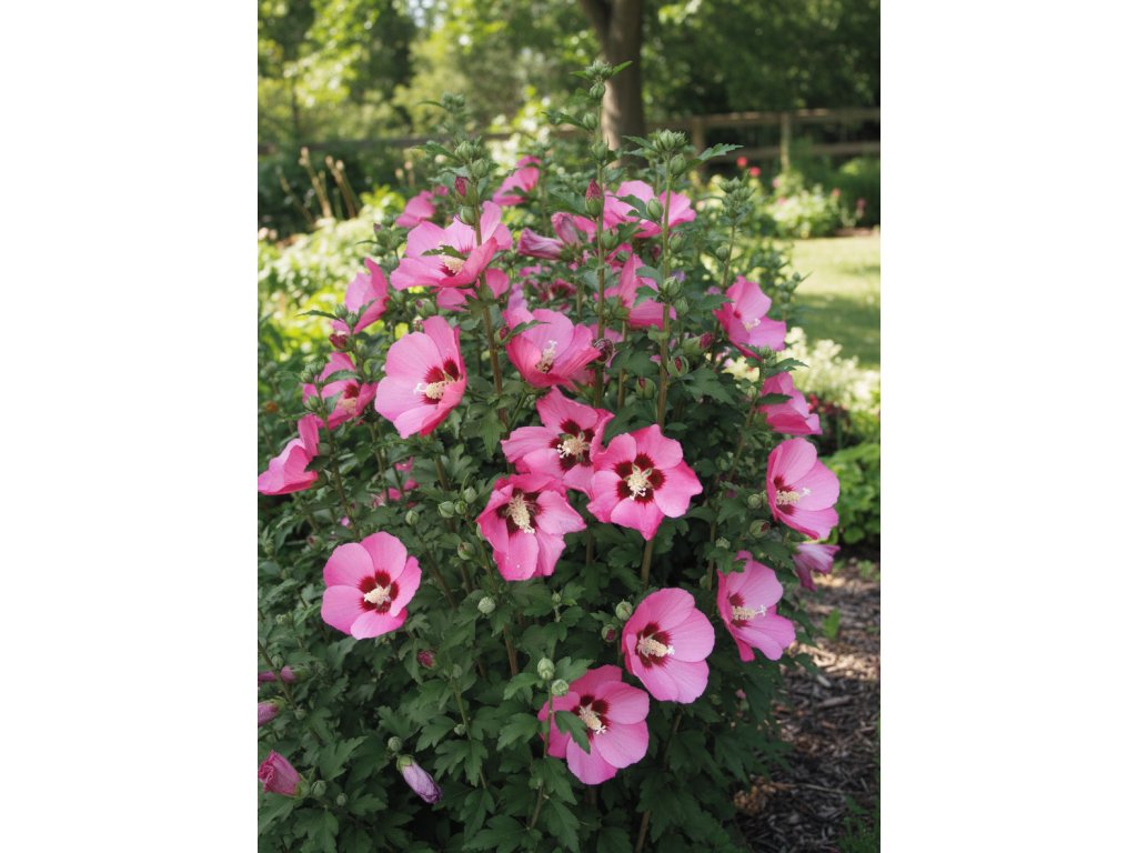 Ibišek syrský ‘Pink Giant’ (Hibiscus syriacus ‘Pink Giant’) díky své velikosti květů patří mezi nejpůsobivější odrůdy ibišku a stává se dominantou zahrady od léta až do podzimu.