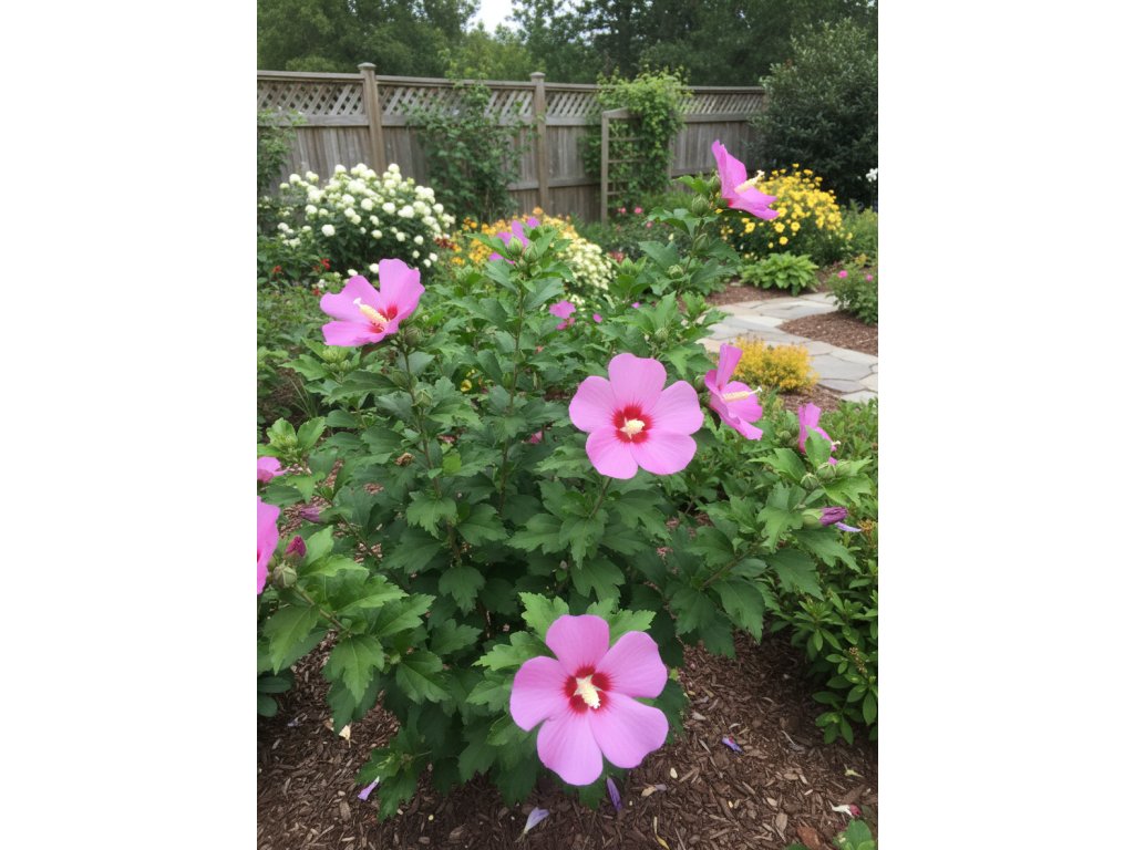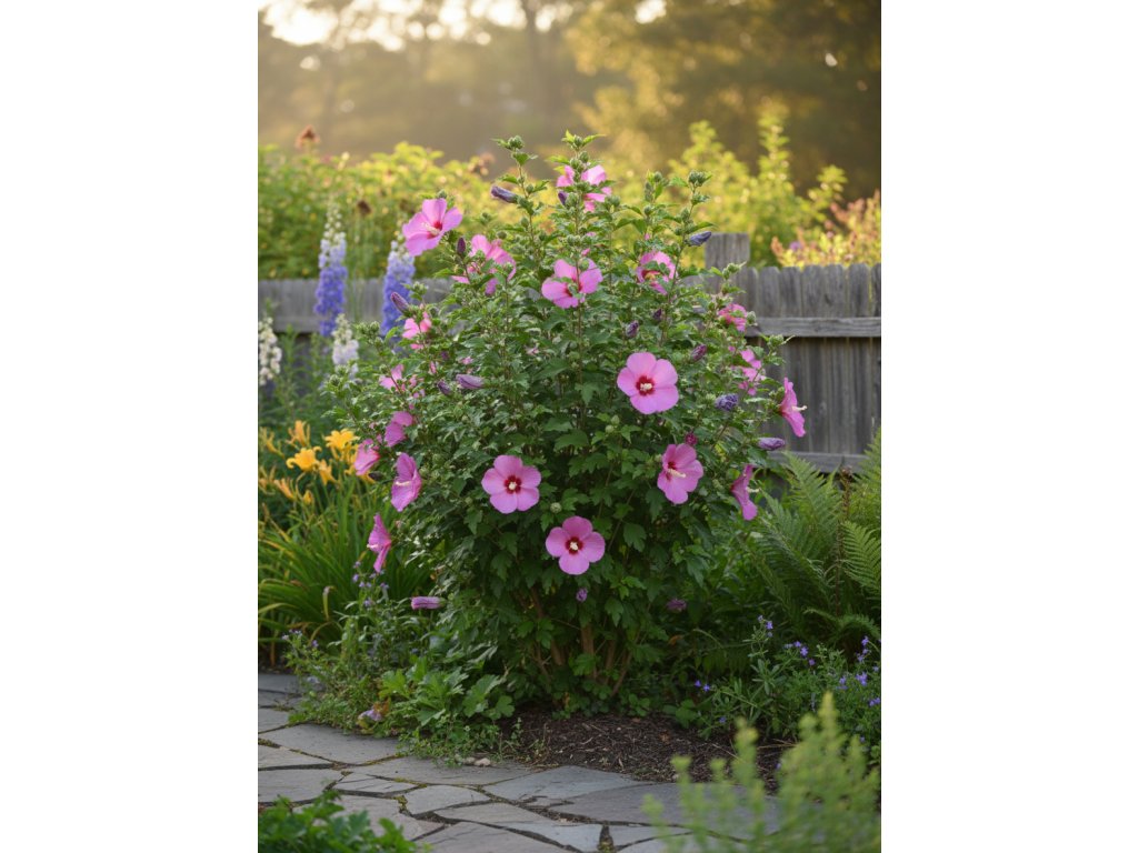 Ibišek syrský ‘Woodbridge’ (Hibiscus syriacus 'Woodbridge') je velmi atraktivní opadavý okrasný keř, který vyniká velkými, sytě růžovými květy s výrazným tmavě červeným okem uprostřed. Kvete dlouho, od léta až do podzimu, a patří mezi nejoblíbenější odrůdy ibišku do letních zahrad.