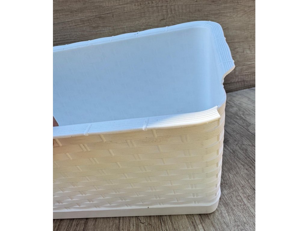Tento konkrétní kus má prasklý roh – viz fotografie u produktu. Jedná se o kosmetickou vadu, která nemá vliv na celkovou funkčnost truhlíku ani misky.