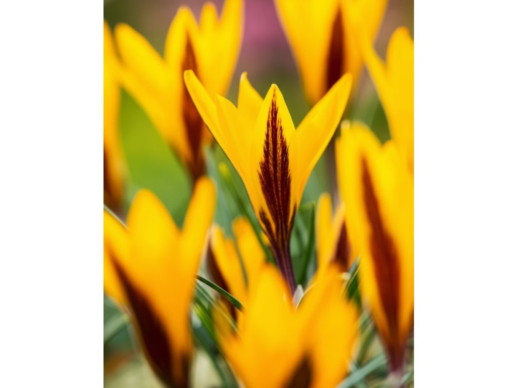 Krokus 'Angustifolius' pochází z Ukrajiny a Arménie. Potěší vás svými krásnými květy žluté barvy s tmavě fialovými pruhy. Květy jsou obklopeny malými, úzkými listy, které jsou zajímavé svým světlejším pruhem uprostřed.
