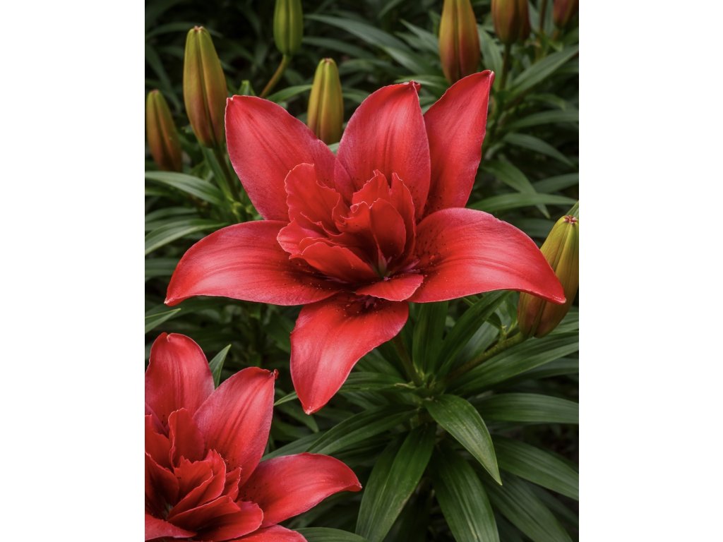 Lilie 'Bald Eagle' vyniká zářivé, třešňově červenými květy s hluboce miskovitým tvarem a velmi plnými středy, které dohromady vytvářejí impozantní celek. Okvětní plátky zdobí navlněné okraje, což dodává květu další stupeň krásy a ojedinělosti. Tato lilie je také vhodná pro řez květů, což znamená, že se můžete těšit na úžasně barevné aranžmá i uvnitř domu.