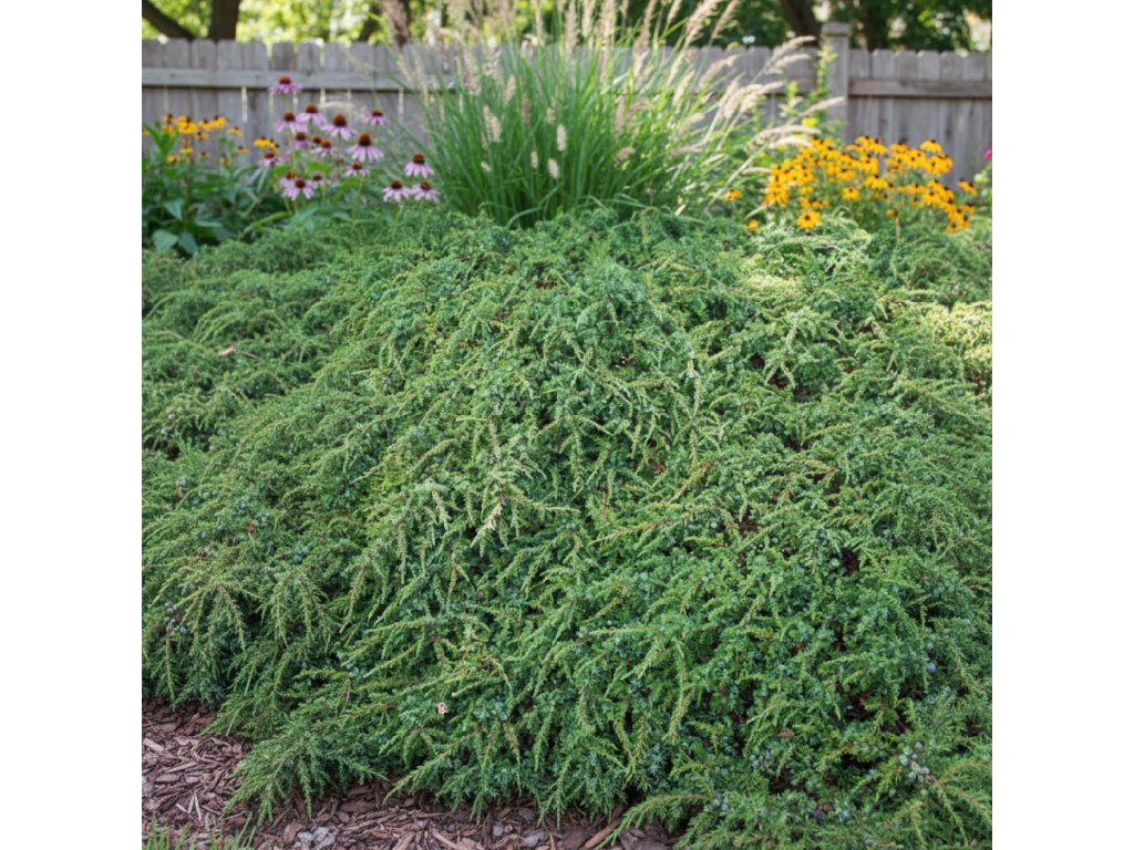 Jalovec obecný 'Green Carpet' (Juniperus communis 'Green Carpet') je nízký, plazivý kultivar, který, jak jeho jméno napovídá, vytváří hustý zelený koberec. Jeho větve se přirozeně rozrůstají do stran a elegantně přepadají přes zídky nebo okraje skalek. Dorůstá výšky pouze 15 cm, ale do šířky se může rozrůst až 180 cm, přičemž dokonale kopíruje terén.