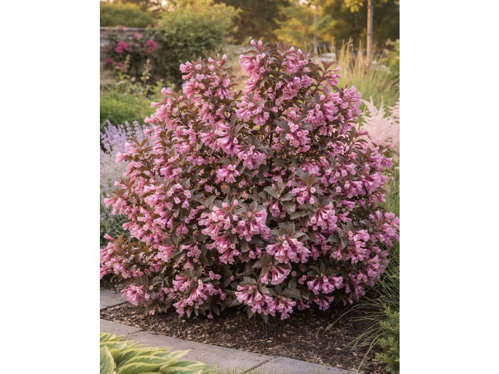 Vajgélie květnatá (Weigela florida) 'Purpurea' je dekorativní keř dorůstající do výšky 1,5–2 metry, který zaujme tmavě purpurovými listy a světle růžovými květy. Kvete od května do června a její květy vynikají na pozadí tmavého olistění, což z ní činí skvělou volbu pro okrasné záhony nebo živé ploty.