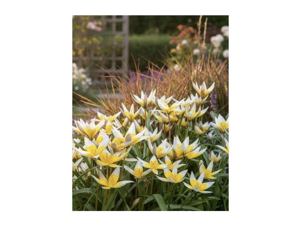 Tulipán 'Tarda Dasystemon' (Tulipa tarda syn. dasystemon) je skutečný poklad mezi podzimními cibulovinami. Tento drobný, ale nápadný druh botanického tulipánu kvete zářivě žlutými květy s bílými špičkami. Během slunečných dnů se rozevírají do tvaru hvězdy. 'Tarda Dasystemon' je ideální pro skalky, okraje záhonů či přirozené výsadby. Kvete velmi brzy na jaře a jeho hvězdicovité květy nádherně vyniknou na slunci.
