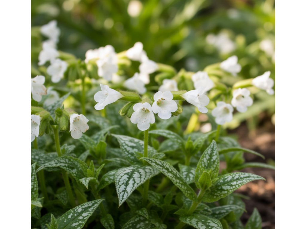 Plicník lékařský ‘Sissinghurst White’ (Pulmonaria officinalis) patří k neopomenutelným jarním trvalkám, které zkrášlují stinné zahradní partie. Od března až do května přináší čistě bílé, jemně zvonkovité květy, které vyrůstají z bledě růžových puků. Tvoří krásný kontrast k tmavě zeleným, široce vejčitým listům s dekorativními bílými skvrnami. Listy zůstávají atraktivní po celou vegetaci a zdobí záhon i mimo období květu.