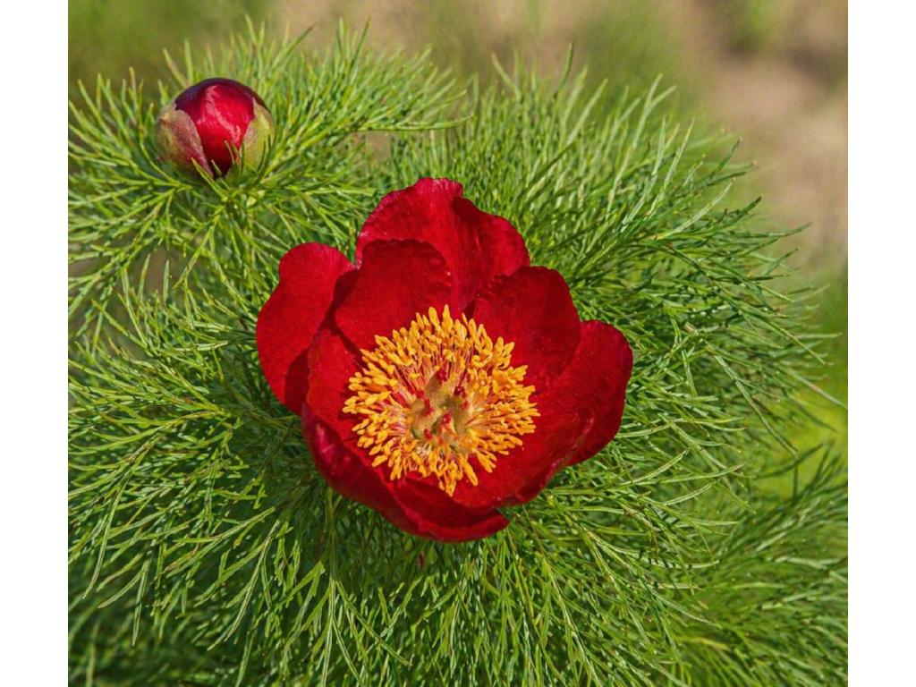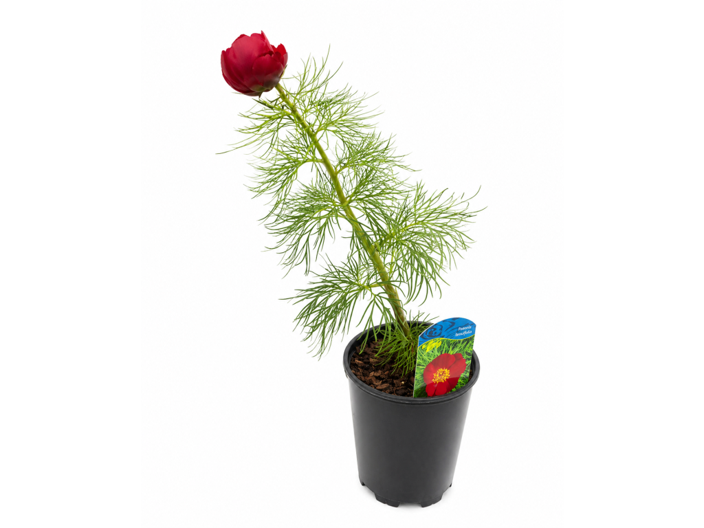 Pivoňka úzkolistá (Paeonia tenuifolia), někdy nazývaná také koprolistá, je jedinečná a velmi dekorativní trvalka s jemně dělenými, úzkými listy připomínajícími kopr a výraznými sytě červenými květy. V květináči 12×12 cm představuje kvalitně zakořeněnou rostlinu připravenou k výsadbě na zahradu, kde se stane nepřehlédnutelnou dominantou záhonu.