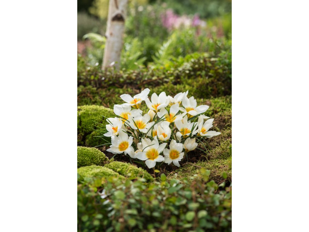 Krokus 'Snowbunting Chrysanthus' si vás získá krásnými bílými květy. Tento jedinečný krokus pochází z Řecka a Turecka. Ohromí vás svou krásou i pod stromy nebo na trávnících, záhonech či v květináčích. Nejlépe vynikne ve velkých skupinách.