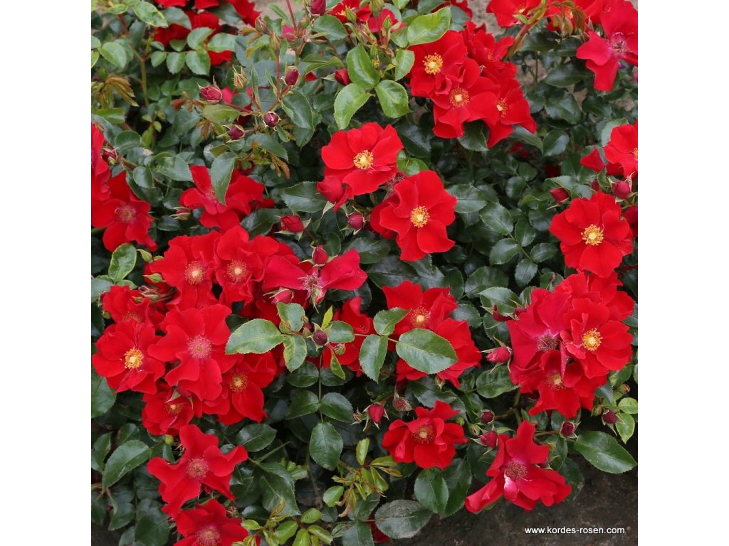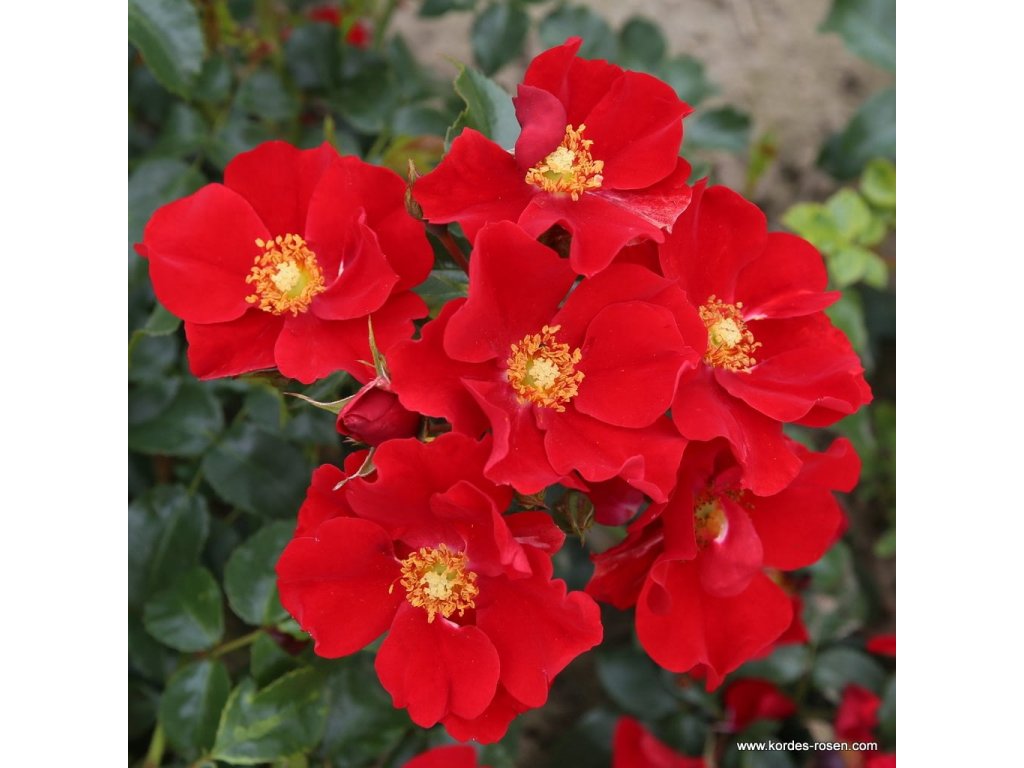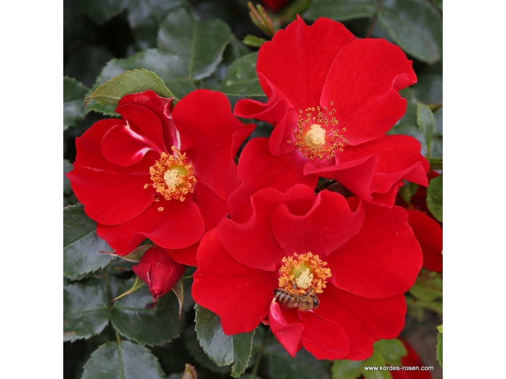 Půdopokryvná růže 'Alexander von Humboldt®' (Rosa 'Alexander von Humboldt') zkrášlí vaši zahradu jednoduchými jasně červenými květy se žlutými tyčinkami. Květy dosahují velikosti okolo 6 cm a přitahují včely.