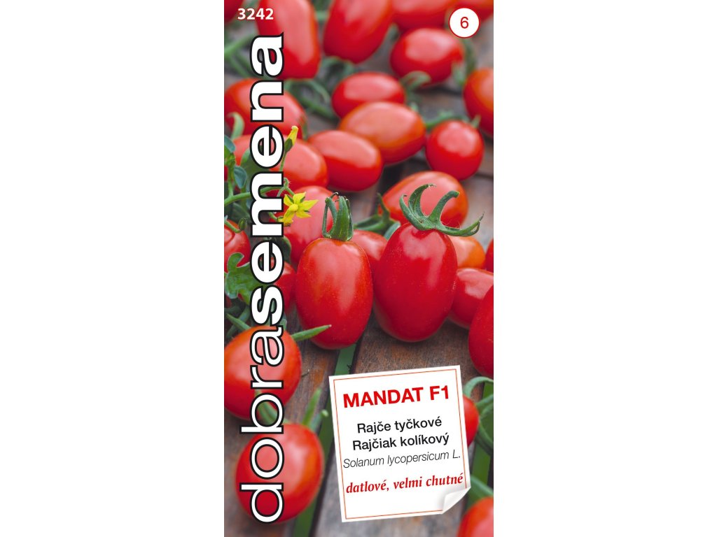 MANDAT F1 - velice plodný hybrid červeného datlového rajčete. Rostlina nese bohaté vijany s 20 - 25 drobnými, válcovitými plody o hmotnosti 10 - 15 g. Plody jsou sladké, pevnější a nepraskají. Tento hybrid tyčkového rajčete je vhodný pro pěstování na záhonu i na studené rychlení.