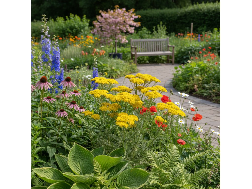 Řebříček tužebníkovitý 'Coronation Gold' (Achillea coronation) se pyšní sytě žlutými, plochými květenstvími o průměru až 10 cm. Rozkvétají od července do září. Tato výrazná trvalka dorůstá výšky až 100 cm. Vzpřímené, pevné stonky nesou nad kompaktními trsy šedozelených listů květy vhodné k řezu i sušení. Skvěle se hodí do smíšených trvalkových záhonů, na venkovský i moderní záhon.