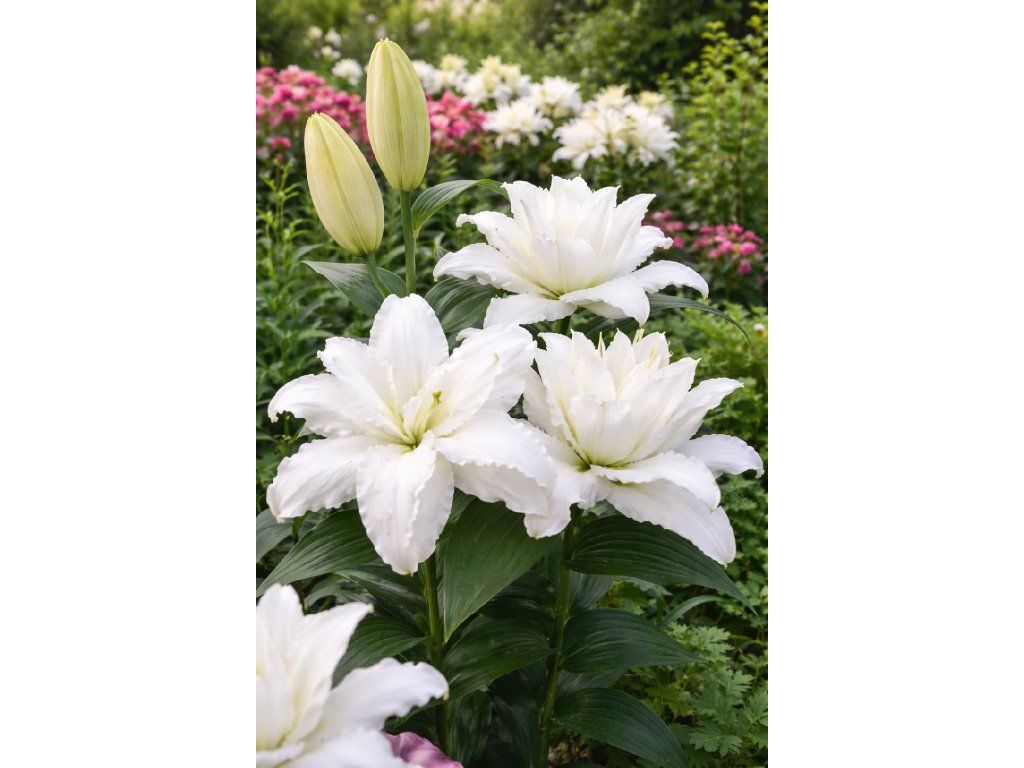 Lilie 'Roselily Cyrilla®' (Lilium 'Roselily Cyrilla®') patří do série Roselily, která vyniká velkými, plnými květy připomínajícími růže. Elegantní květy v něžném bílém odstínu jsou bohatě vrstvené a příjemně voní. Na pevných stoncích dorůstají přibližně 80–100 cm. Květy se objevují od června do srpna a vytvářejí výraznou dominantu záhonů. Díky svému romantickému vzhledu je tato lilie ideální k výsadbě do trvalkových záhonů i jako luxusní řezaná květina do vázy.