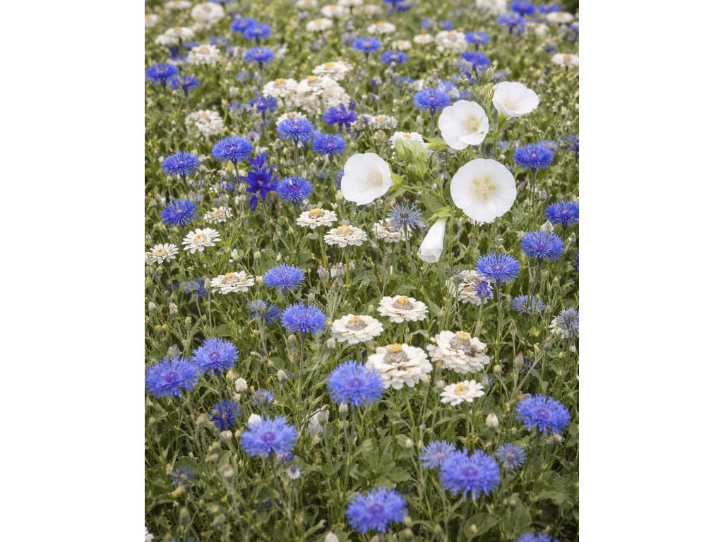 Směs 17 letniček v modré barvě například chrpy, nestařce, šalvěje rozjasní bílí beránci v podobě cínie, slézovky a dalších.