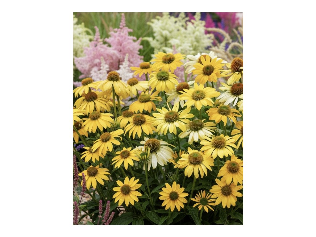 Třapatkovka 'Mellow Yellows' (Echinacea purpurea 'Mellow Yellows') je okouzlující trvalka s květy v různých odstínech žluté, které vytvářejí veselý a živý efekt. Kvete od července do září a její květy s výrazným středem jsou atraktivní pro opylovače, jako jsou včely a motýli. Tato odrůda je skvělou volbou pro přírodní zahrady, smíšené trvalkové záhony nebo jako solitér.