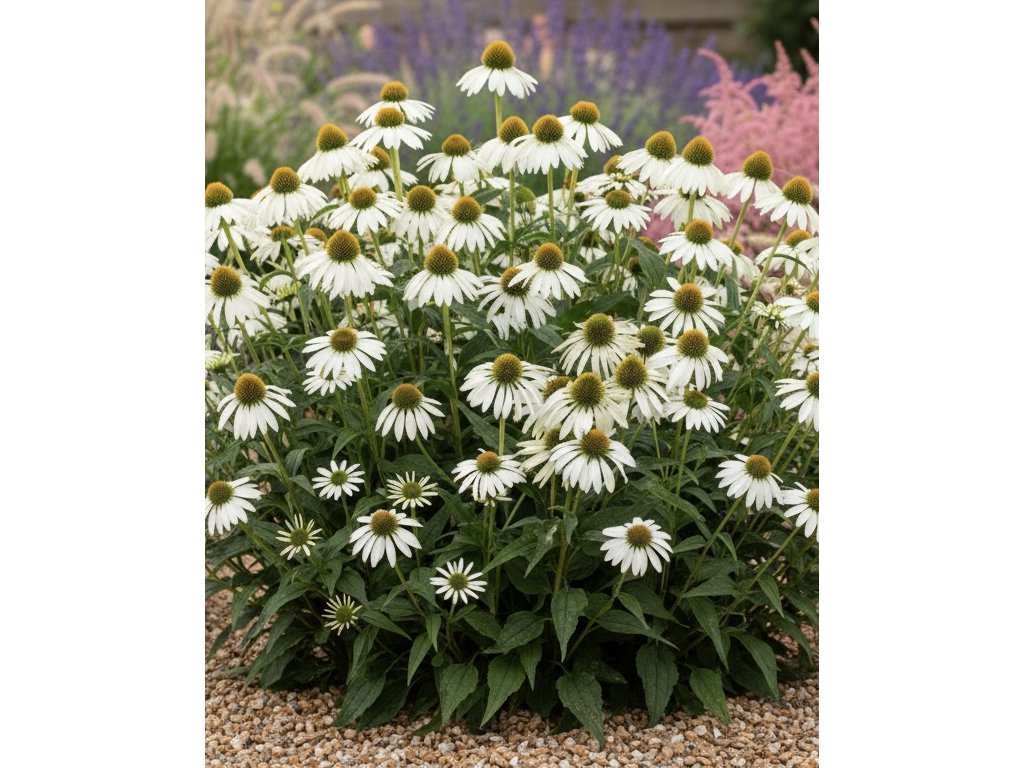 Třapatkovka 'Purpurea Alba' (Echinacea purpurea 'Alba') je půvabná trvalka s čistě bílými květy a kontrastním zeleno-oranžovým středem. Tato elegantní odrůda kvete od července do září a je ideální pro smíšené trvalkové záhony, přírodní zahrady nebo jako solitér. Její květy přitahují včely, motýly a další opylovače, což z ní činí skvělý doplněk do ekologicky zaměřených zahrad.