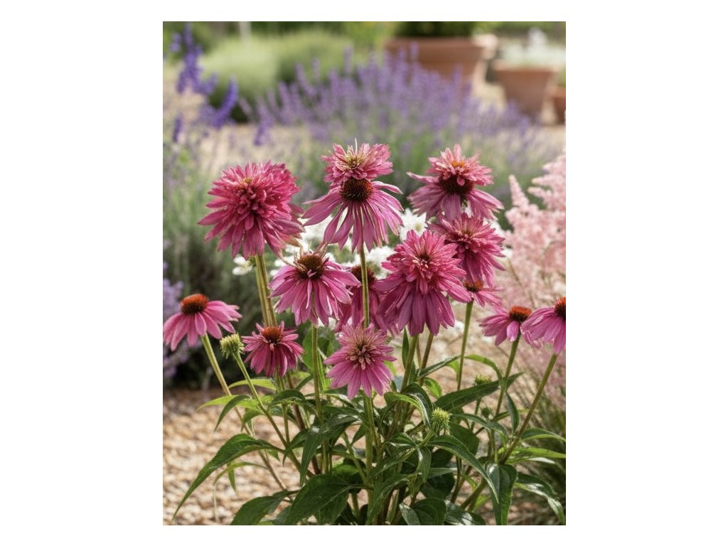 Třapatkovka nachová 'Purpurea Double Decker' (Echinacea purpurea) je fascinující trvalka s unikátními dvouvrstvými květy. Spodní vrstvu tvoří klasické růžové lístky a na horní části květního terče vyrůstá druhá sada okvětních lístků, což vytváří efektní vzhled. Kvete od července do října a dorůstá do výšky 80–100 cm.