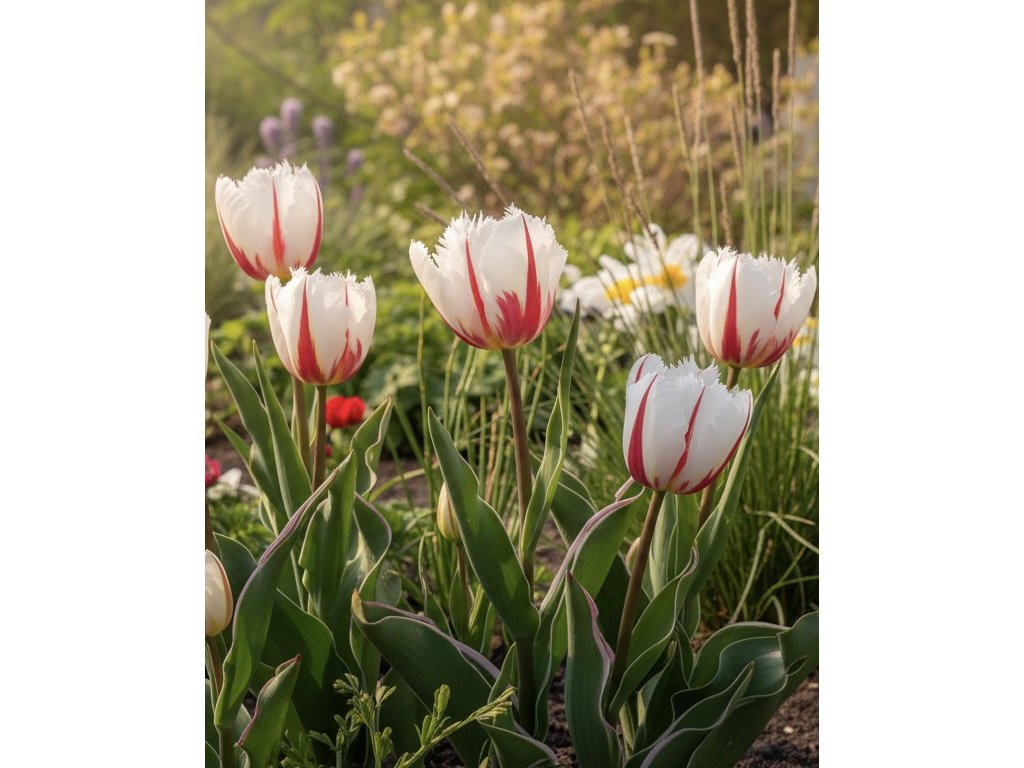 Tulipán (Tulipa) 'Salsa' je neobvyklá odrůda dvoubarevného tulipánu, který vás zaujme svou jedinečnou kombinací barev. Je většinou bílý, se zubatými červenými pruhy, které se táhnou od základny okvětních lístků ke špičce.