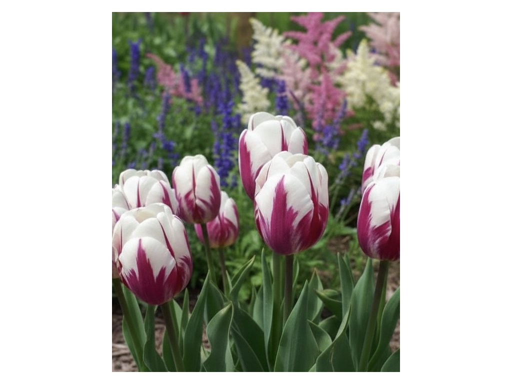 Tulipán 'Happy Feet' (Tulipa 'Happy Feet') je veselý růžový tulipán, který zaujme svými jemně růžovými okvětními lístky s tmavě růžovými plamennými akcenty. Tento krásný květ stojí na tmavém stonku se zelenými listy a dorůstá výšky 50 cm.
