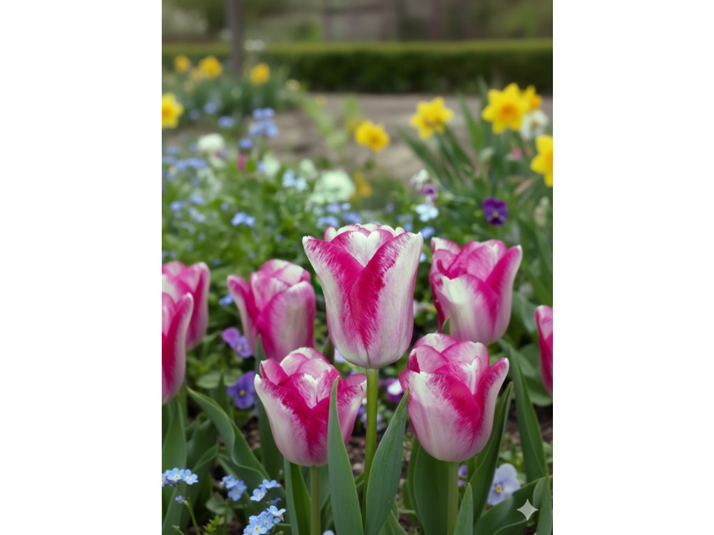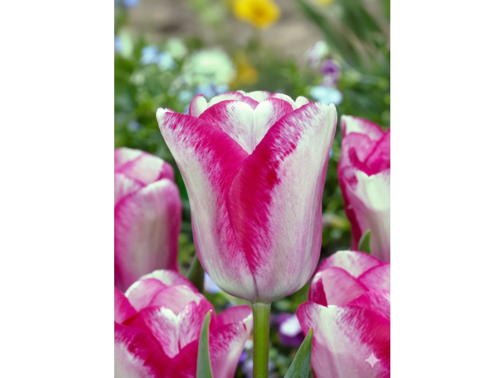 Tulipán 'Mata Hari' (Tulipa 'Mata Hari') je elegantní odrůda s exotickým vzhledem, který zaujme na první pohled. Během dubna a května rozkvétá výraznými bílými květy s malinově červeným až načervenalým okrajem, které krásně kontrastují s trsem svěže zelených listů. Dorůstá výšky kolem 60 cm a je ideální do skupinových výsadeb i k řezu do váz.