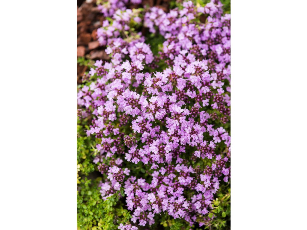 Mateřídouška časná 'Minor' (Thymus) pokryje každý nevzhledný kout. Jedná se totiž o nízkou, půdopokryvnou trvalku s drobnými světle fialovými květy a hustým růstem. Má vejčité drobné zelené listy a dorůstá do výšky pouze 5 cm. Je odolná vůči suchu a sešlápnutí.
