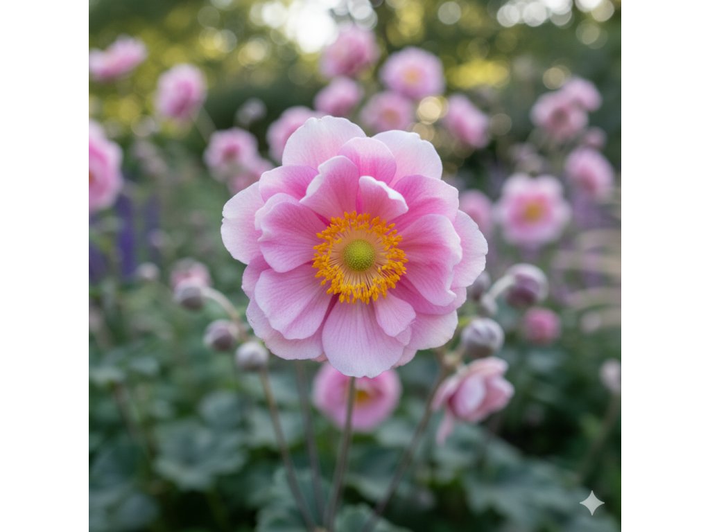 Sasanka japonská 'Königin Charlotte' (Anemone hupehensis 'Königin Charlotte') zpestří zahradu v době, kdy většina květin už odkvétá. Tato podzimní trvalka rozkvétá od srpna až do října na pevných stoncích množstvím světle růžových květů se žlutým středem. Květy dosahují až 7 cm v průměru a jsou vhodné také k řezu. Rostlina dorůstá výšky kolem 70–100 cm..