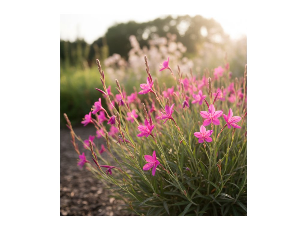Svíčkovec 'Baby Butterfly Dark Pink' (Gaura lindheimeri 'Baby Butterfly Dark Pink') vás okouzlí dlouhým a bohatým kvetením od června až do podzimu. Tato trvalka tvoří husté trsy s úzkými zelenými listy a jemnými, temně růžovými květy, které se na tenkých stoncích elegantně pohupují ve větru. Díky své výšce do 30 cm je ideální do popředí záhonů, k lemování cest nebo do nádob.