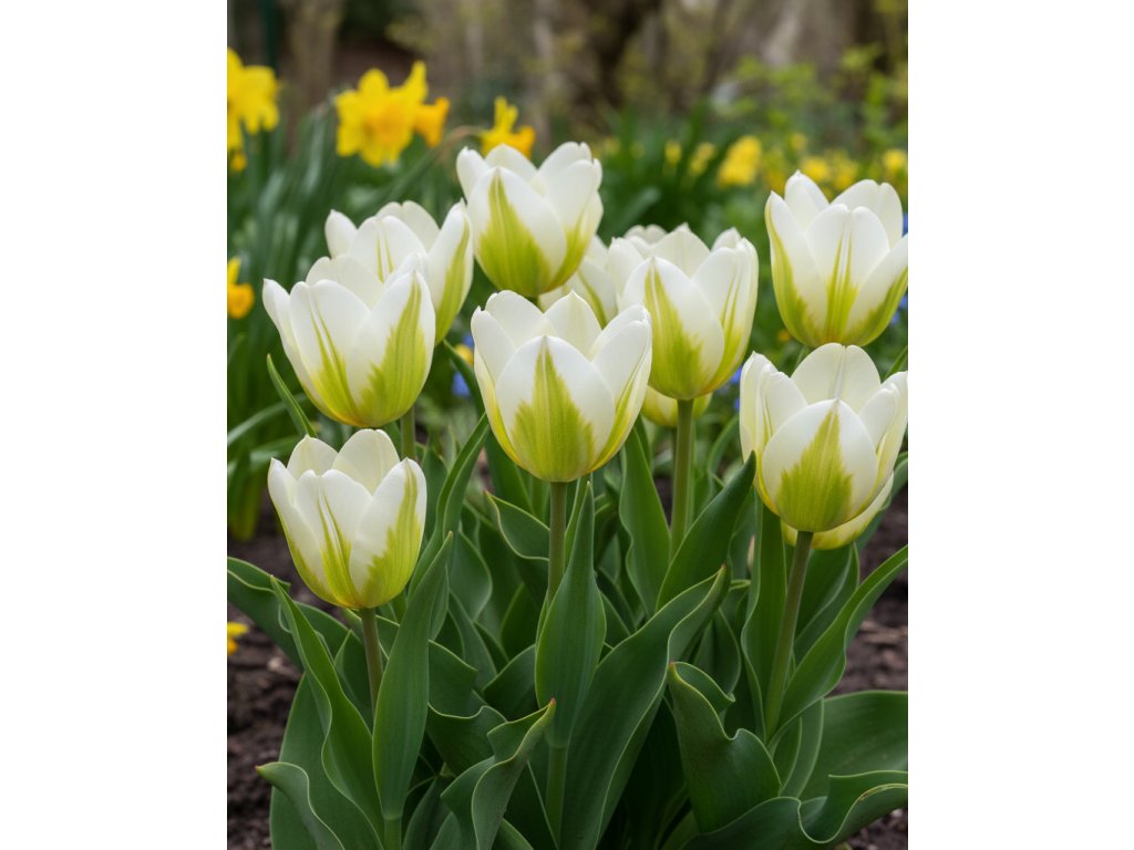 Tulipán viridiflora ‘White Spring Green’ (Tulipa viridiflora ‘White Spring Green’) zaujme elegantními bílými květy se zeleným středovým pruhem, typickým pro tuto skupinu. Působí svěže, moderně a krásně vyniká v kombinaci s ostatními jarními cibulovinami.