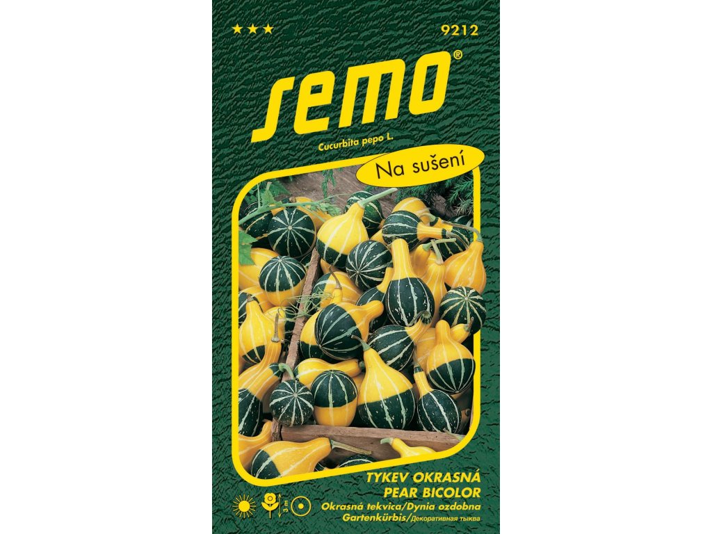 Dvoubarevné žlutozelené plody ve tvaru drobných hruštiček. Lehce se vysuší, nehnijí a tvoří dlouhodobou dekoraci. Jednoletá poléhavá rostlina s dlouhými výhony. Pěstujeme jako jiné tykve, můžeme ji nechat popínat po pergole nebo jiné konstrukci. Přináší množství drobných plodů ve směsi barev a tvarů. Upřednostňuje slunnou lokalitu a teplé záhřevné půdy.