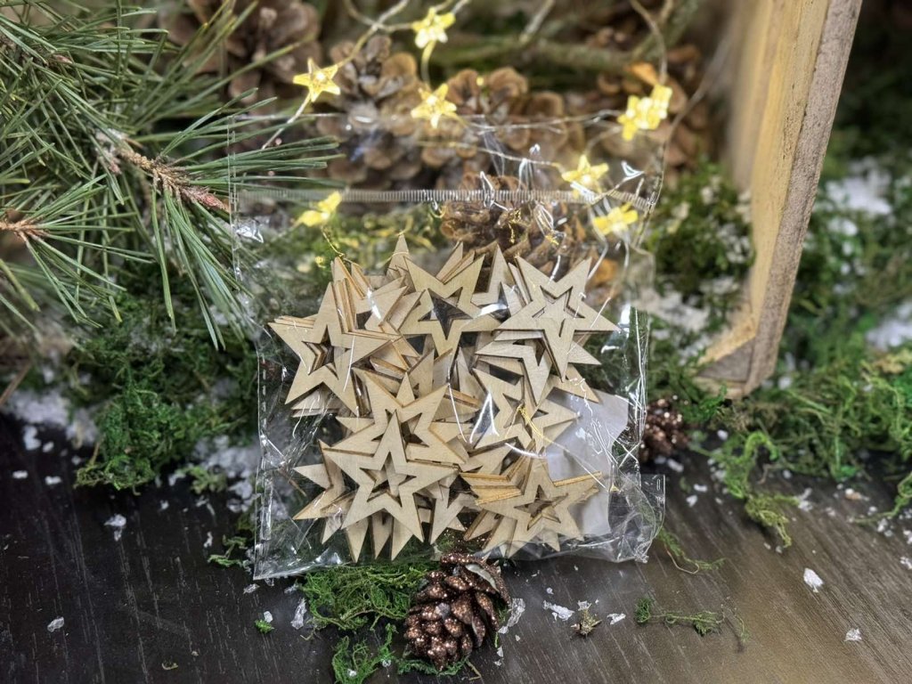 Sada dřevěných ozdob ve tvaru hvězdiček vynikne v každé zimní i vánoční dekoraci.