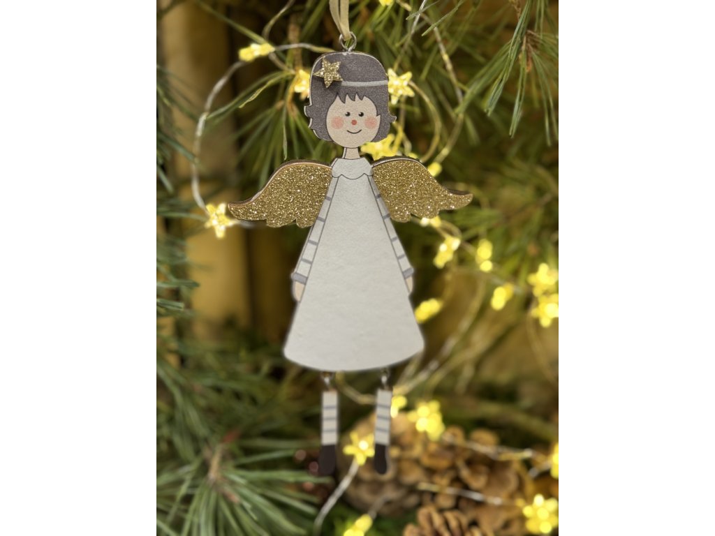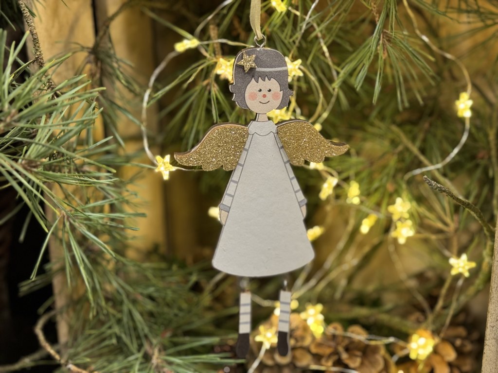 Dřevěná ozdoba na stromeček v podobě anděla s velmi milou a působivou malbou a třpytivými křídly.