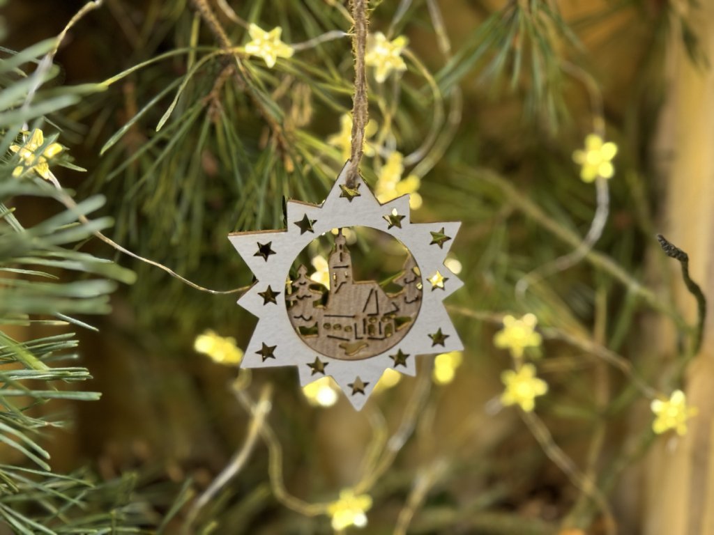 Zkrášlete váš domov či stromeček s ozdobami v přírodním stylu. Přidejte do vaší sbírky něžnou vyřezávanou ozdobu s kostelem.