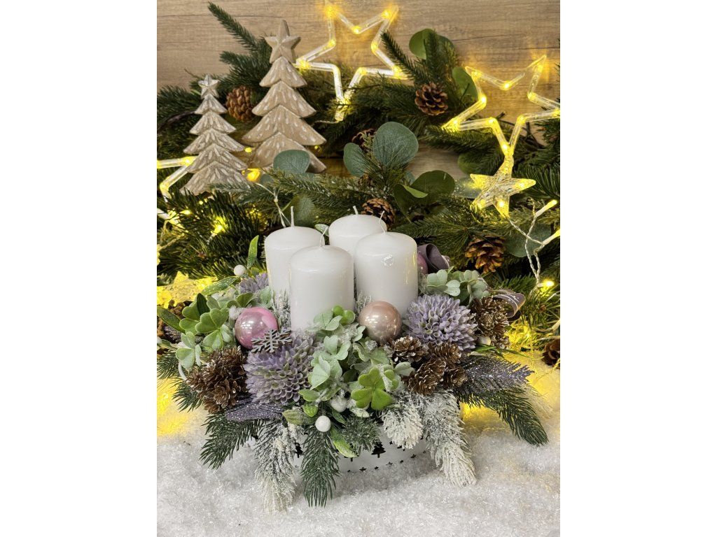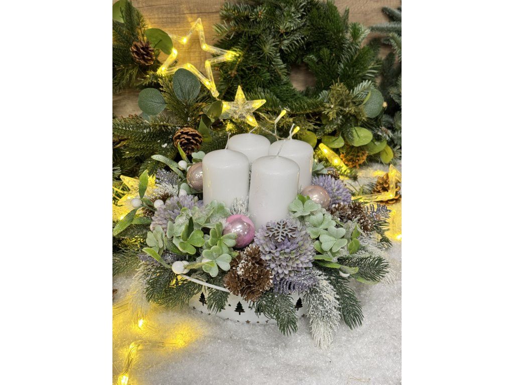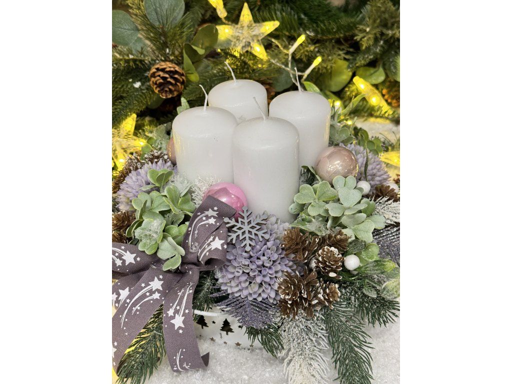Tato elegantní adventní dekorace v kovové misce přináší do vašeho domova nádech zimní elegance. Čtyři bílé svíčky jsou obklopeny zasněženým jehličím, přírodními šiškami a fialovými,, třpytivými květinami, které společně vytvářejí jemnou a slavnostní atmosféru. Velká mašle dodává celé kompozici nádech sofistikovanosti a kouzla. Ozdoby a detaily v lesklých a matných tónech harmonizují s kovovým základem a dodávají dekoraci moderní vzhled.Vyrobená z kvalitních permanentních materiálů, tato dekorace zaručuje dlouhou životnost a stálou krásu. Ideální pro vánoční stůl, tato dekorace vynikne svou krásou a jedinečnost