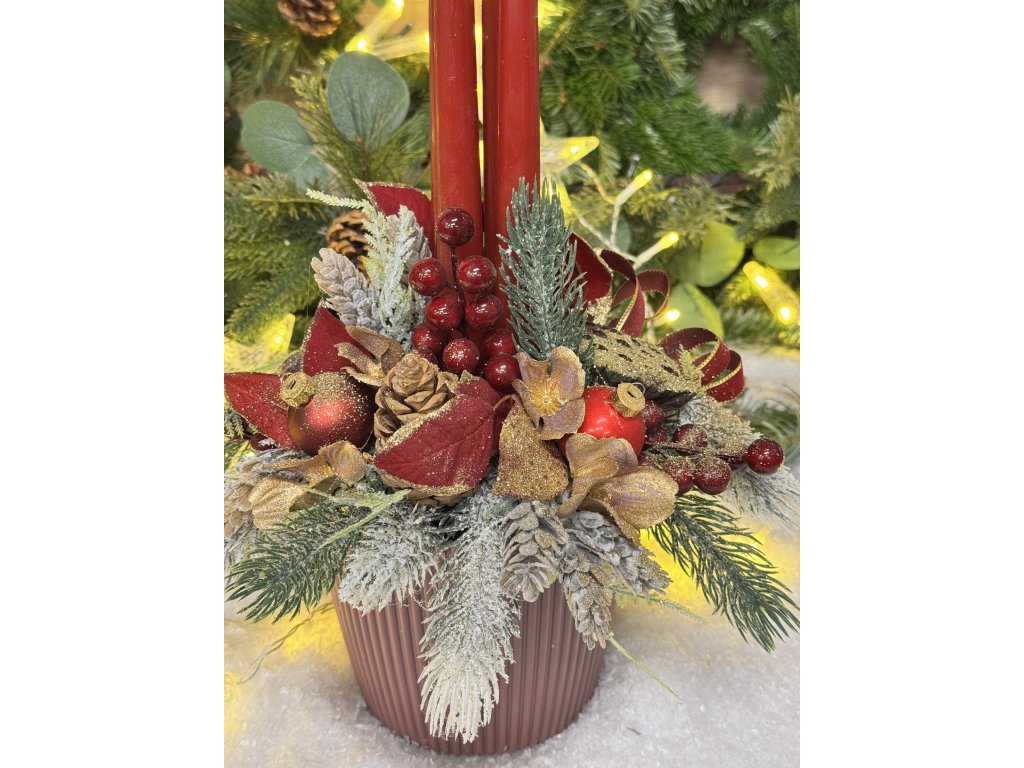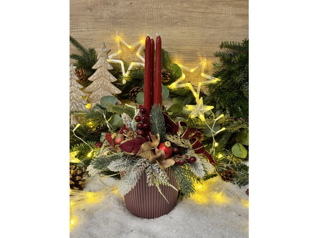 Vytvořte si kouzelnou vánoční atmosféru s touto jedinečnečnou adventní dekorací v květníku. Bohatě zdobený kombinací červených svíček, šišek, jehličí, zlatých a červených ozdob, umělých bobulí a květin. Červené a zlaté tóny detailním zpracováním přináší luxusní a slavnostní vzhled. Po svátcích lze svíčky snadno odstranit a květník využít jako zimní dekoraci. Vyroben z kvalitních permanentních materiálů, které zaručují dlouhou životnost a zachování vzhledu. Tato adventní dekorace je dokonalou volbou pro váš stůl, komodu či jako dárek pro vaše blízké. Přineste si do domova tu pravou vánoční náladu!
