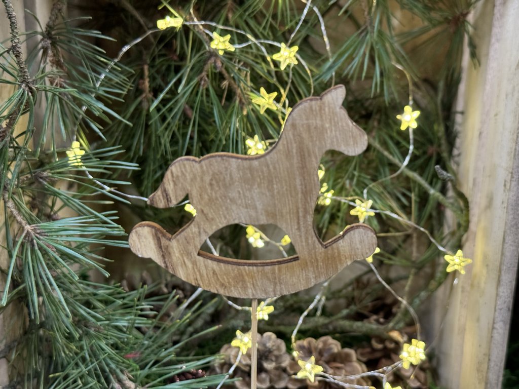 Zapichovací ozdoba s houpacím koníkem působí velmi elegantně. Skvěle doplní vaše zimní a vánoční dekorace. Vhodná k dozdobení váz, květináčů a dalších dekorací.