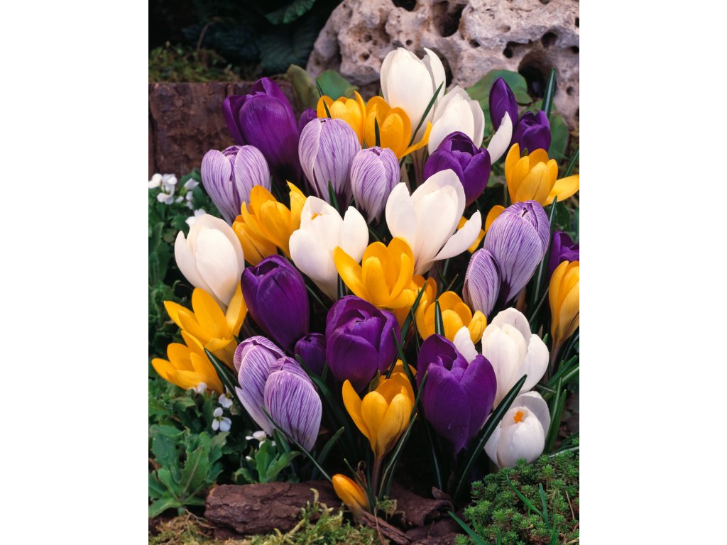 Směs krokusů vykouzlí na vaši zahradě či skalce radostný barevný záhon. Krokusy slibují krásnou podívanou, díky svým velkým něžným květům. Od bílých přes odstíny fialové, až po oranžovou, s naší směsí se vaše zahrada rozehraje barvami.