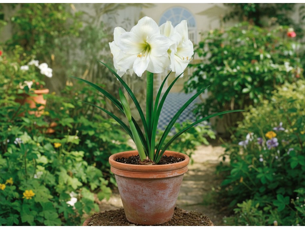 Hvězdník 'Mont Blanc' (Hippeastrum Mont Blanc) na první pohled upoutá svými sněhově bílými květy se žlutým stínováním. Tyto velké květy působí velmi elegantně a svěže.