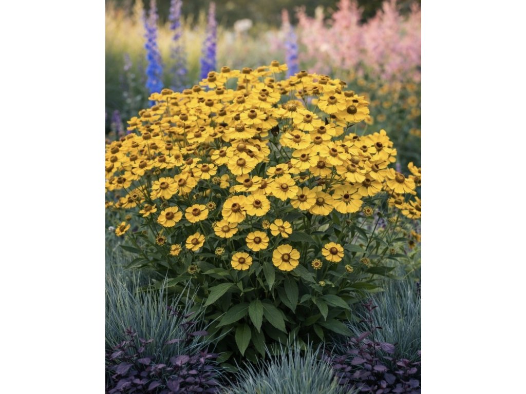 Záplevák 'Zimbelstern' je jeden z největší zápleváků vůbec. Tato rostlina z čeledi hvězdnicovitých vám doroste až do výšky 150 cm. Získá si vás svými zlatožlutými květenstvími s mahagonovými skvrnkami a tmavě hnědým středem.